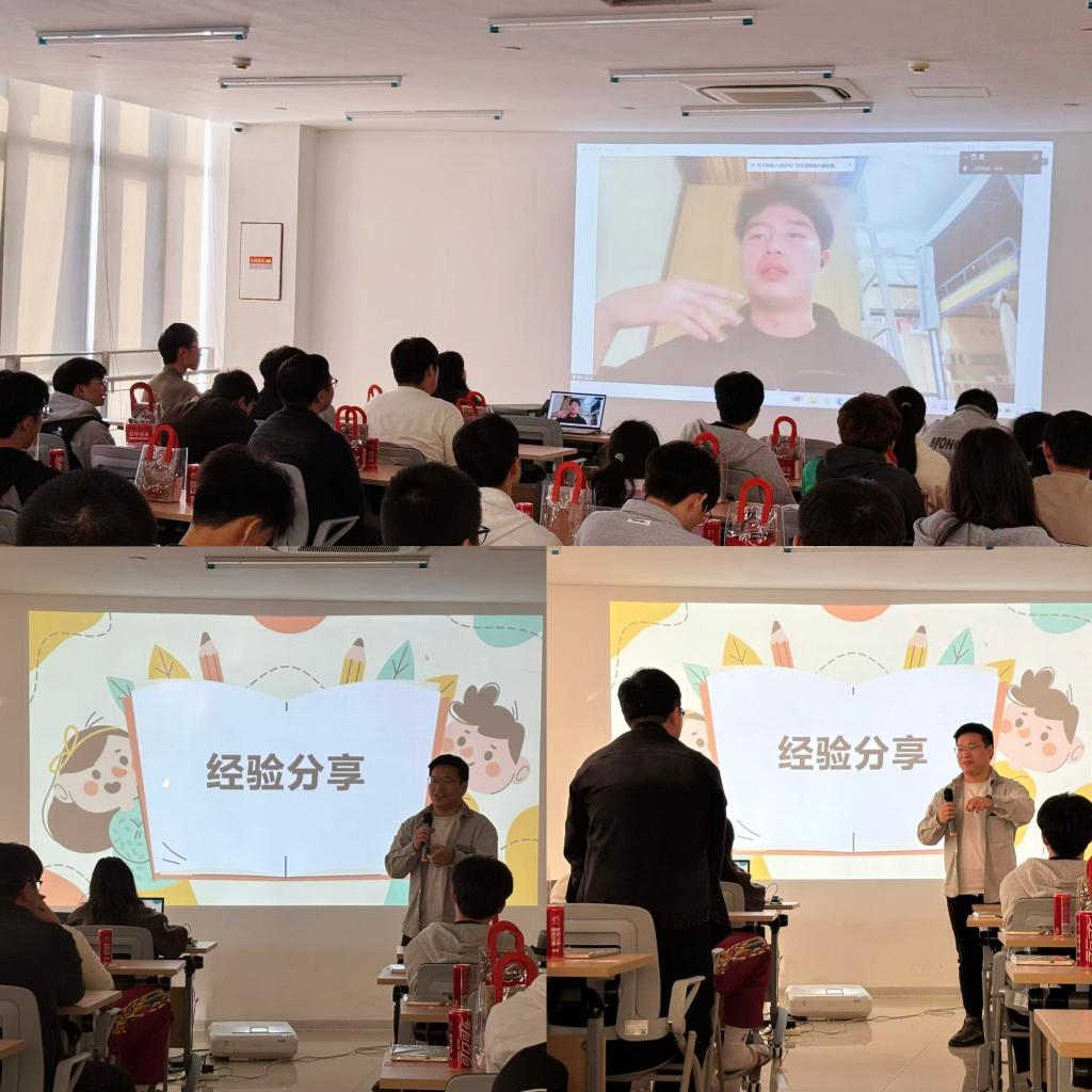 随后的学长经验分享与互动答疑环节,依旧是本次活动的“硬核”亮点。我们邀请到光电制造学院的两位优秀学长——何欣承与陈坤,他们今年分别以优异成绩考入浙江工业大学、温州大学,带着满是诚意的备考“干货”而来。从择校策略、时间规划和各科备考技巧,展开全方位、接地气的分享。其中,陈坤学长专程来到现场与学弟学妹面对面交流,何欣承学长虽路途遥远,但也通过腾讯视频连线的方式全程参与分享。针对政治热点梳理、英语作文模板运用、专业课知识精炼等冲刺需求给出建议,并结合经历强调“平和心态+规律作息+积极自我暗示”对缓解焦虑的作用。互动环节中,面对学子们提出的“冲刺阶段时间如何合理分配”等问题,学长们结合亲身经历逐一细致解答,给出了极具参考价值的方案。