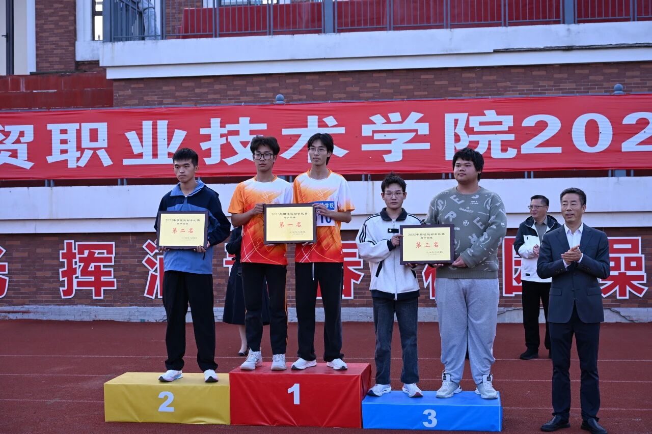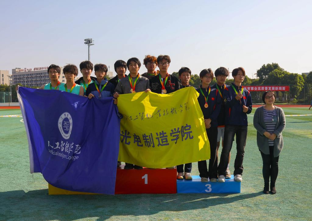 操场上,颁奖仪式简洁而热烈。光电制造学院的师生围聚一处,目光热切地聚焦于中心。站在领奖台上的代表脸上洋溢着欣慰与自豪,台下的队员们昂首挺胸,眼中闪着拼搏后的光亮。