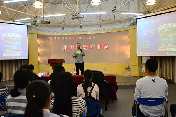 范杉老师首先与在座的同学们分享了自己的“地掷球情缘”,在与地掷球“相依为伴”的日子里,自己曾经历过太多的困惑和难题,但是,因为自己对地掷球的热爱而一一克服这些挫折。结合个人成长历程和阅历,他指出,当代大学生必须要树立人生梦想,学会自我约束管理,激发自己的潜能,坚持到底,抓住机会,才能促成飞跃,并向同学们提出五点希望:1.爱国,爱校,爱家,爱自己;2.做好职业生涯规划,确定短期目标;3.相信自己,补短试误;4.发扬体育精神,做更快更高更强的自己;5.选择一项自己感兴趣的体育运动,并坚持下去。