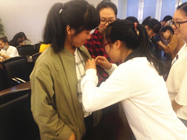 老生代表们给新生佩戴校徽