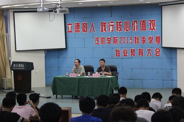 9月11日,汽机学院在阶梯教室开展2015年秋季始业教育。此次大会围绕“立德树人,践行社会主义核心价值观”的主题。考虑到2013级和2014级同学新学期需要努力的方向,学院针对学生需求开展了两场不同内容的始业教育。