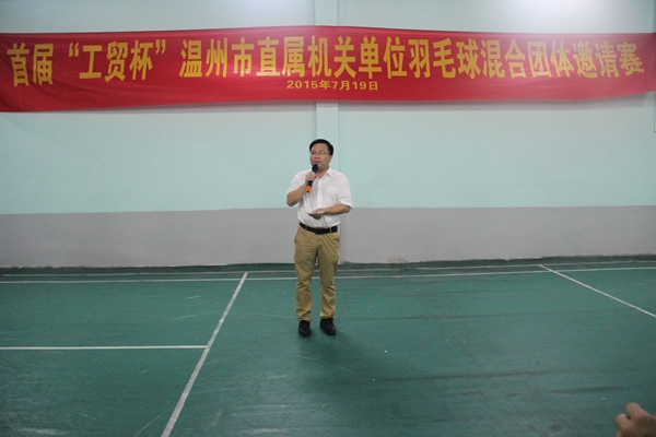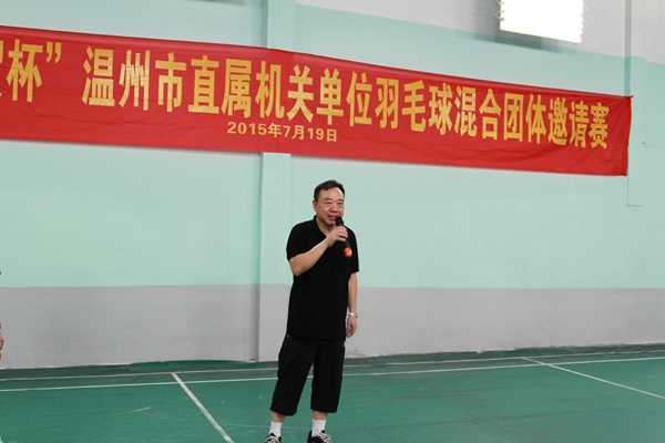 学院党委书记盖庆武宣布首届“工贸杯”温州市直属机关单位羽毛球混合团体邀请赛正式开始