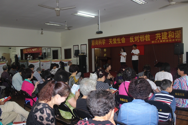 随着背景音乐的响起,活动正式开始,在来自实践队的两位主持人介绍完各个出席嘉宾之后,来自鹿城区反邪教学会的许臣玉秘书长代表致辞,在致辞中实践队员深知反对邪教组织的斗争是科学与伪科学、文明与封建愚昧、正义与邪恶的斗争,也是长期复杂艰巨的政治任务。维护社会稳定,保障人权和保护人民生命财产安全,捍卫科学的尊严,便成为了实践队员以及每一个人的责任。