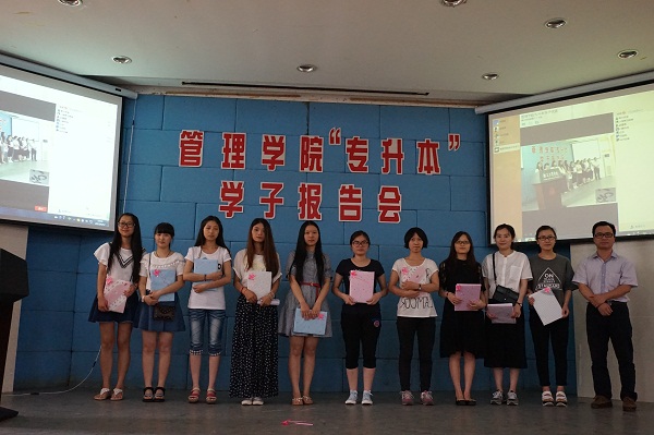 6月12日下午三点半,管理学院“专升本”学子报告会在阶梯教室举行。报告会邀请了2015届管理学院成功升本科的毕业生,还特别邀请了历年专升本成功的管理学院校友代表,通过在线方式与现场同学进行沟通交流,她们分别是会计0604刘春、酒管0701滕伟伟、人力0901何洒莉、导游0901赵建青、会计1004应洁、信管1101范婷婷。在这些同学之中,有从本科院校毕业参加工作的,有马上从本科院校毕业的,还有正在本科院校就读的校友。管理学院2013、2014级各班均派代表参加,报告会由管理学院党总支张勰老师主持。本次活动的主要目的一方面是表彰升本成功的学生;另一方面,通过现场与在线交流,使在校生加深对专升本的认识和理解。
