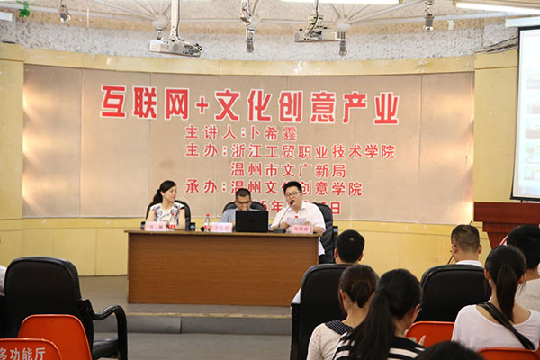 6月25日下午,中国传媒大学文化发展研究院书记、副院长、温州文化创意学院院长卜希霆在1号教学楼二楼多功能厅作以“互联网+文化创意产业”为主题的讲座,此次讲座由工贸学院和温州市文广新局主办、由温州文化创意学院承办,讲座由温州文化创意学院副院长吴同喜主持。卜希霆院长围绕互联网+时代背景,互联网+文化创意产业新机遇,互联网+文化创意产业转型,互联网+创意、创新、创业,这四个方面进行主题内容的讲述。