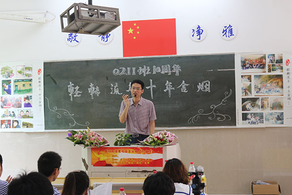 时任电子系辅导员的吴学亮老师更是精心给同学们准备了带有学校logo的纪念品,用抢答的方式让同学们重新回忆曾经的寝室房间号、曾经上过课老师的名字;为了引导同学们关心关注母校的发展,还用猜猜看的方式让同学们猜一下:学校现在有几个院系、电子系有几个专业、电子系每年考上本科的学生数量是多少等等。最后,每位同学都走上台介绍了自己的工作经历,分享自己在学校曾经留下的美好回忆。