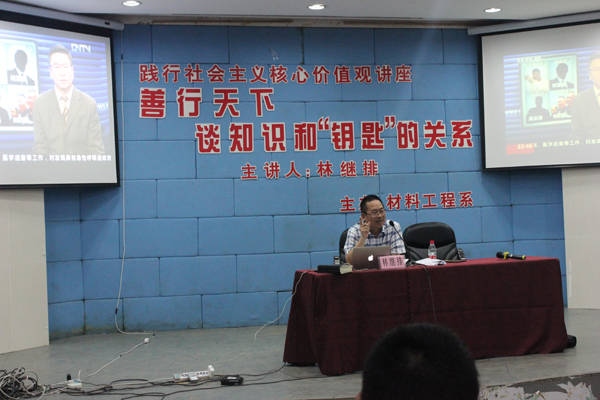 为了提升学生道德修养,自觉践行社会主义核心价值观, 6月2日晚,材料系邀请全国首个公职人员百万道德建设基金创立者林继排先生为全院300多名学生作“善行天下 谈知识和‘钥匙’的关系”道德讲座。