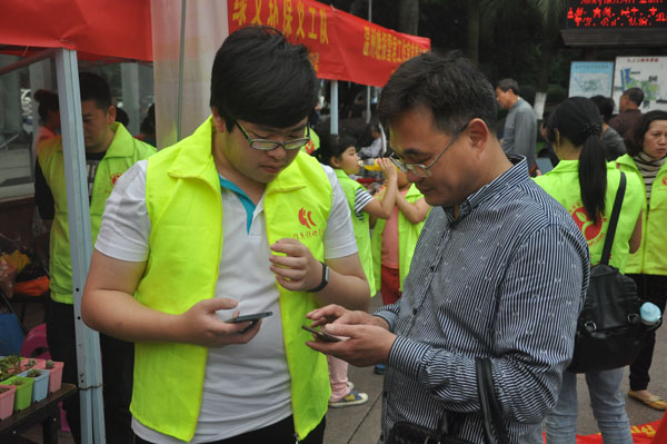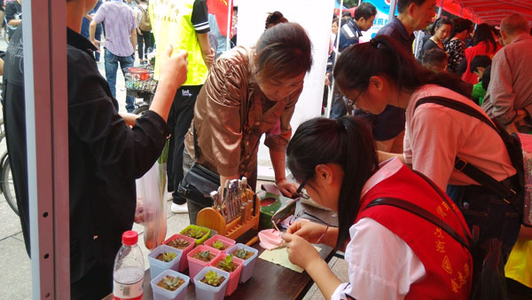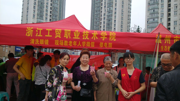 活动现场,志愿者们为大家提供了免费清洗维护眼镜、电脑义诊、教老年人学微信、以旧换绿等多项服务。活动一开始,便吸引了不少老年人前来询问,志愿者们利用自己所长,热情周到地为每位市民服务。有的老人眼镜需要清洗,眼视光专业的志愿者便用带来的仪器细心地为他们清洗调整眼镜;有的老人不会使用微信保存图片,志愿者们手把手地教他们怎么保存;有的老人的电脑出了故障,信息专业的志愿者便用自己所学为他们解决;还有的老人十分喜爱绿色的多肉植物,便用手中的废旧物品与志愿者们交换。