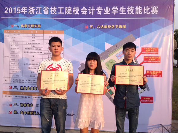 技师学院(杭州校区)陆红英老师指导的1413会计班钱梦婷同学获该次赛事会计从业资格知识竞赛项目二等奖,曹艳红老师指导的1306会计班姚俊杰同学和1307会计班级曹文豪同学获该次赛事单据录入和原始凭证竞赛项目三等奖。技师学院(杭州校区)在全省22所参赛技工院校中取得团体总分第6的好成绩。