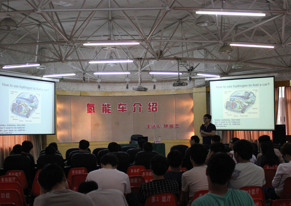 钟老师向同学们简单地介绍了氢能车的结构原理,又通过播放视频生动具体地展示氢能车的工作机制,向同学们展示了氢能车不仅仅存在于理论,而且已经开始成为现实。在钟老师的演讲中,同学们了解到汽车行业未来的发展,将更加亲和环境,从以石油为燃料转化为以氢能为燃料,更加有效率并且环保无害。生动的图片视频让同学们感受到氢能车这个划时代的伟作。