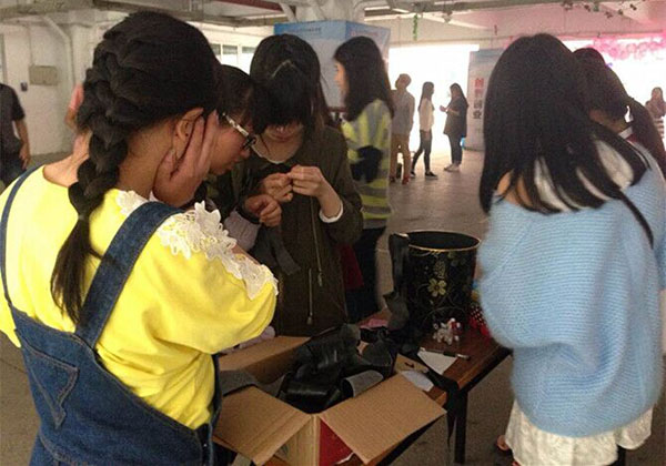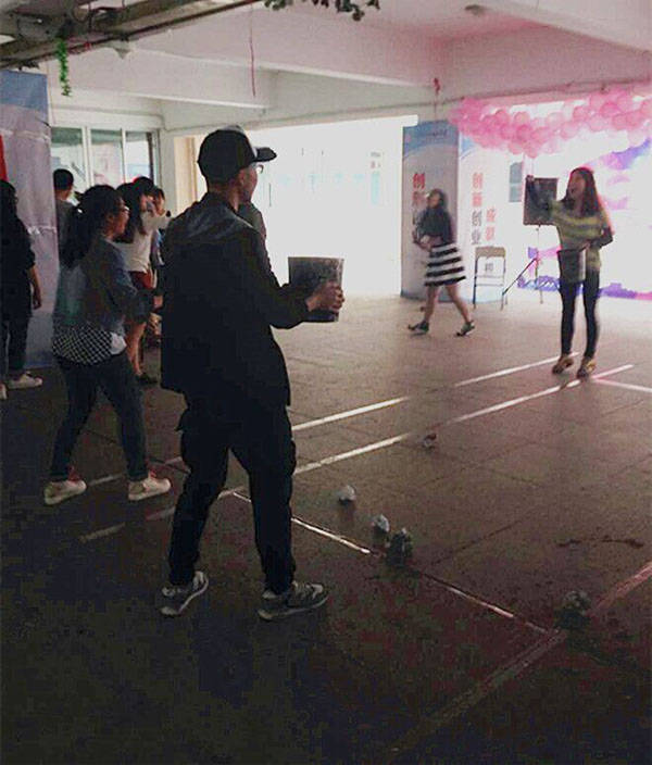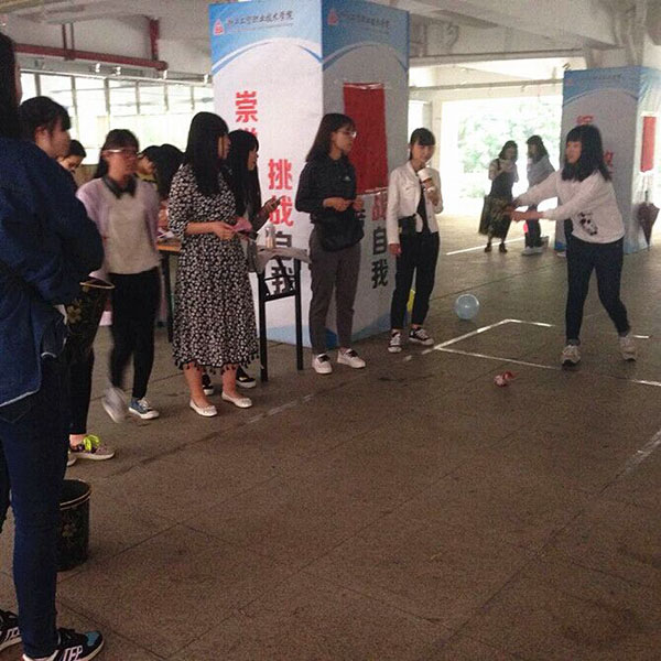 在F2楼下,可以看见规划整齐的趣味活动,参赛者只要领取入口处的游戏券就可以进行游戏,在活动结束后凭券进行抽奖,领取奖品。今年的大比拼活动较以往不同的是更考验两人之间的合作与默契程度。例如“踢毽子”,两两一组,以相互来回踢的方式进行,一个来回为一组,组数最多的取胜。还有“扔纸篓”游戏,一扔一接需保证接的时候不能越过线,另一个小伙伴能够准确接住,这充分考验两个小伙伴的的默契和对尺度的感觉。其余还有“捡豆子”、“蒙眼行走”、“穿针引线”等新活动。来参与游戏的同学们络绎不绝,片片欢声笑语!