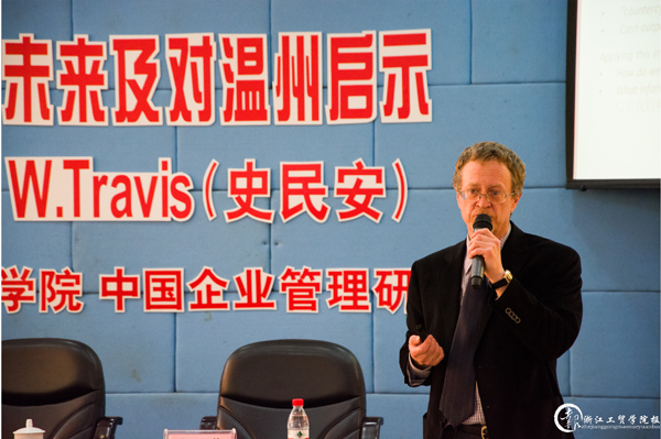 Travis Seamier的中文名为史民安,其此次来校的主要目的是寻求与我院的合作机会,同时也是基于他对温州民间借贷的研究课题,到校之前便事先与我校林贵教授交流,探讨有关民间借贷事宜。在校期间,Travis为学院师生带来了一场生动有趣且富有内涵的公益讲座,主题为“全球金融危机:过去、现在和未来及对温州启示”。讲座内容既涉及全球金融发展的翔实数据,也涵盖了温州民间借贷当前的发展现状及趋势。Travis还极具挑战地选择了用中文讲述,虽然很难清晰地用中文专业术语解读金融现象,但其精神以及讲座所实现的效果是可贵和可圈可点的,受到了广大师生的好评。互动环节中,Travis还用四种语言送出了对学院55周年校庆的祝福。