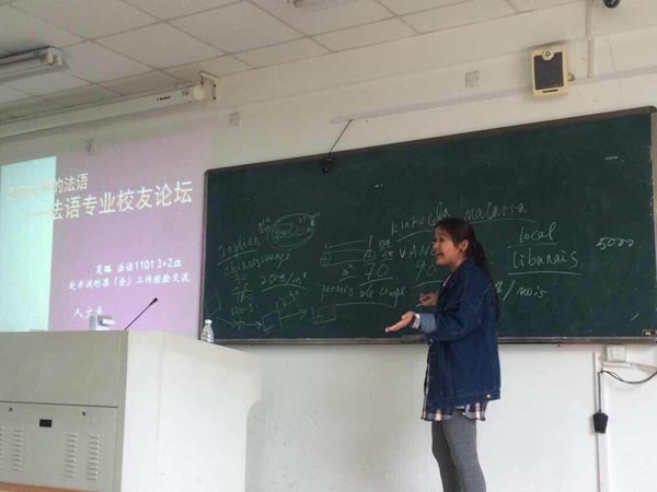 会上,夏璐同学声情并茂,形象生动地从就业途径、工作情况、法语应用和当地风土人情4个方面与在场师生进行交流。她根据自己的经历提出求职要主动、眼界要开阔、基础要扎实、不浮躁、耐得住寂寞、吃得了苦头、要学会适应、学会坚持、挖掘潜力等建议,告诫下几届同学要打好基础、早做准备、抓住机遇、永不言败。会后,在场师生开展了热情的交流。她本次来校的目的之一是参加学校55周年校庆,其二是给应届毕业生带来就业岗位和项目。