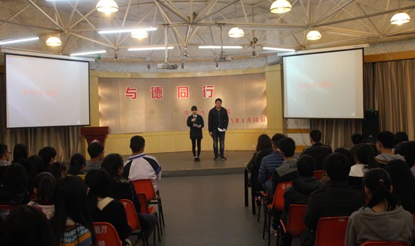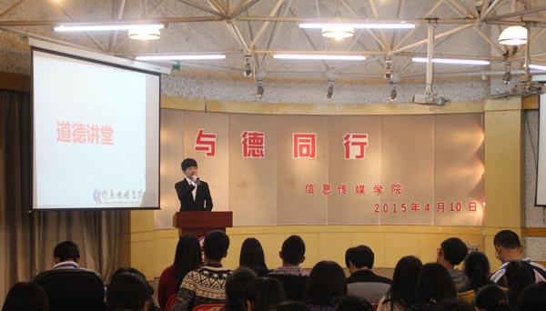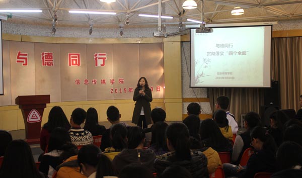 4月10日,信息传媒学院在多功能厅举行了以“与德同行,学习贯彻‘四个全面’”为主题的道德讲堂暨入党积极分子培训。