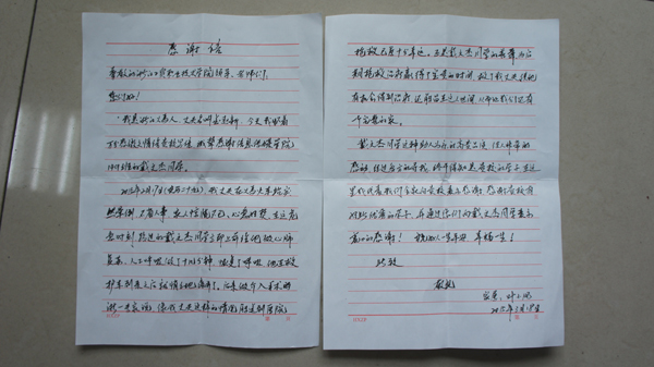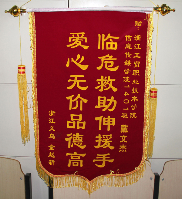 我是浙江义乌人,丈夫名叫金赵新,今天我怀着万分感激之情给贵校写信,诚挚感谢信息传媒学院1401班的戴文杰同学。
