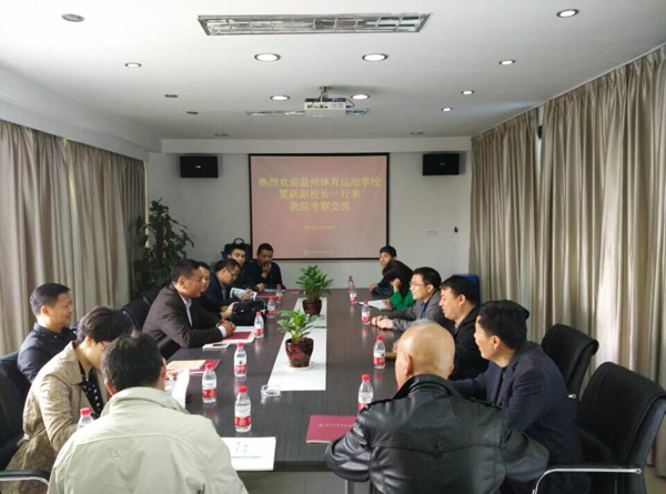 3月18日上午,温州市体育运动学校副校长夏跃一行来我院考察交流。此次考察交流的主要内容是安保消防、信息网络、餐饮、学生管理和校园文化等。