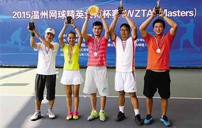 2015年温州网球精英大师杯赛昨天在浙江工贸学院网球中心落下帷幕。刘东亮摘得男子单打冠军,陶佳弈女子单打折桂,谷洲宁/马洪斌获得中年组男双第一,叶雄毅/巫波伦获得常青组男双第一,中年组女双冠军被潘春燕/汪小波摘得。该项赛事首次允许专业退役运动员参加,堪称温州网球史上水平最高赛事。图为获奖选手赛后合影。 王赛珍 摄