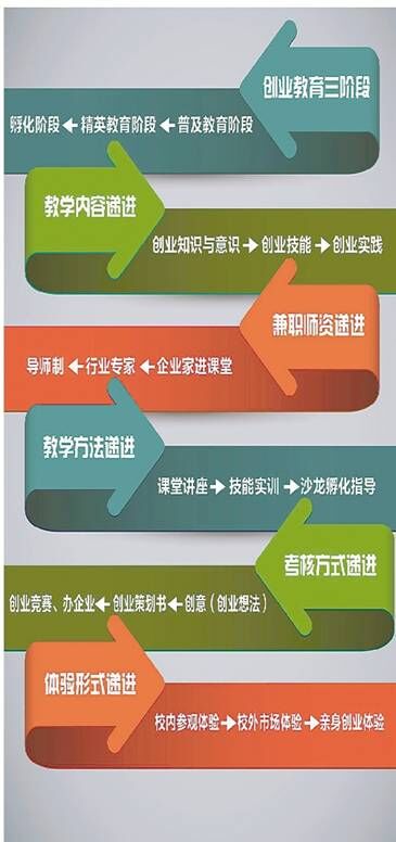 浙工贸自2009年开始构建“专业创业项目+学生创业团队+专业导师+创业园区建设”的人才培养模式,如今学生接受的是阶段式创业教育,包括创业普及教育、创业精英教育和创业孵化三个阶段,根据分阶段特点,在创业教育内容、师资、教学方法、考核方式及体验等方面探索实施递进式创业培养,力求覆盖到全年级学生,深入到创业的不同程度,不断满足大学生对创业教育与实践活动的需求。具体如下图所示:
