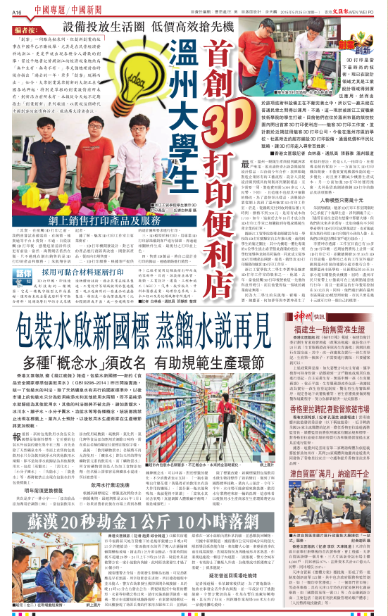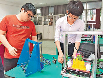 3D打印是當下最時尚的技術,現已在設計領域尤其是工業設計領域得到廣泛應用。然而由於該項技術和設備正在不斷完善之中,所以它一直未能在普通民眾之間得以運用。不過,這一現狀被浙江工貿職業技術學院的學生打破,目前他們在位於溫州市區的該校校園內開出首家3D打印便利店--魅客3D打印工作室,並計劃於近期註冊魅客3D打印公司,今後在溫州市區的學校、社區附近的超市鋪設3D打印設備,通過低價和平民化戰略,讓3D打印走入尋常百姓家。 ■香港文匯報記者 白林淼,通訊員 張靜雅 溫州報道