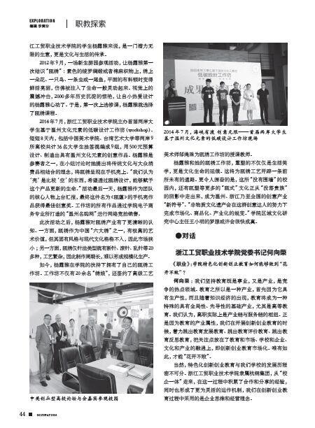2014 年7 月,伟德BETVlCTOR1946主办首届两岸大学生基于温州文化元素的低碳设计工作坊(workshop)。短短8 天内,包括中国美术学院、台湾艺术大学等两岸9所高校共计36 名大学生抽签混编成9 组,用500 元预算设计、制造出具有温州文化元素的创意作品。杨露雅是参赛者之一,在小组讨论时她提出将传统文化与大众消费品相结合的理念,将瓯绣呈现在手机壳上。“我们认为‘壳’是比较‘空’的东西,希望透过瓯绣设计,能够赋予这个产品更新的生命。”活动最后一天,杨露雅作为团队的核心人物上台汇报,最终这件名为《瓯蕴》的手机壳作品获得最佳创意奖。工作坊的所有作品通过学院电子商务专业 所打造的“温州名购网”进行网络竞拍销售。