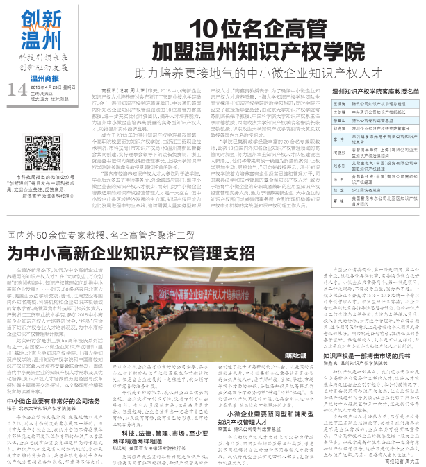 商报讯(记者 周大正)昨天,2015中小高新企业知识产权人才培养研讨会在伟德BETVlCTOR1946举行,会上,温州知识产权学院聘请腾讯、中兴通讯等国内外知名企业知识产权管理领域的10位高管为客座教授,进一步充实优化师资团队,提升人才培养能力,为温州中小微企业培养高质量的实务型知识产权人才,助推温州实体经济发展。