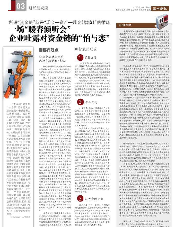 “资金链”究竟是什么东西,无论是大企业家还是小老板都要为之殚精竭虑。说简单了,所谓“资金链”就是三环:“现金—资产—现金(增值)”的循环,在企业经营过程中,必须保持这个循环在良性运转,但是随着市场经济环境的变化,要做到良性运转的难度系数非常之高。在“3·15”这个维护消费者权益的节日里,本报特别联合温州律师协会商(协)会法律事务专业委员会举办了一场“助企开门红·暖春倾听会”,邀请到了温州律师协会商(协)会法律事务专业委员会副主任颜贻潘律师、温州风险投资研究院常务副院长高级会计师刘小娟、绥化温州商会会长徐象明等担任智囊团嘉宾,与会嘉宾和企业讨论的热点自发归结到了一个主题——“‘资金消费者’如何化解风险,维护好自身权益”,这里的风险包括化解债务、担保、借贷、融资等多个方面,与会企业代表的困惑正是当下好多民营企业主的困惑。