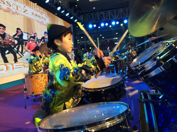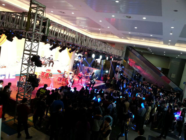 5号馆中庭的天洲西洋打击乐表演。以前大家听摇滚举着荧光棒,现在举着手机。