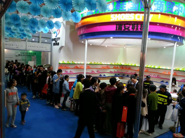 瑞安鞋都在现场免费发放休闲鞋,他们的展位也布置成别距特色的彩虹形状。