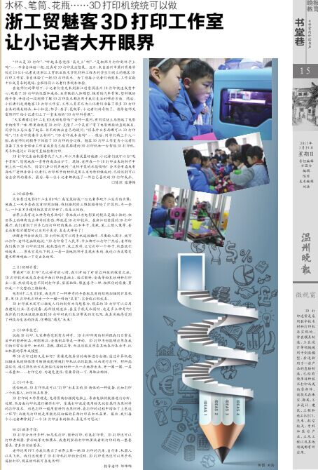 “什么是3D打印”、“听起来感觉很‘高大上’啊”、“是把照片打印到杯子上吗”……不亲自体验一把,还真对3D打印没法想象。近日,来自温州市蒲州育英学校近20位小记者走进伟德BETVlCTOR1946材料工程系的学生们创立的魅客3D打印工作室,亲自体验了一把3D打印技术。为了迎接小记者们的到来,工作室数十位成员来到现场,全程陪同小记者们参观和体验。