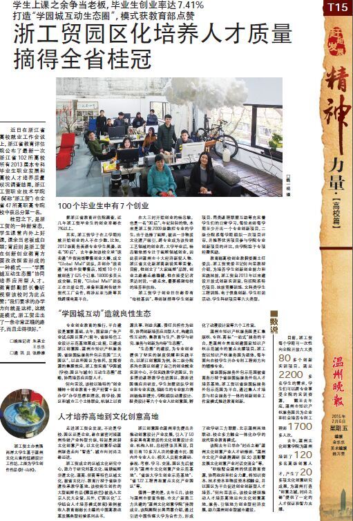 专业创业教育的推行,平台建设是重要基础。去年,国家级广告产业试点园区落户;前年,省级特色工业设计示范基地落成;此前,已建成浙江创意园、温州市知识产权服务园、省级国际服务外包示范园“三大园区”。以这些园区为依托,发挥资源的集聚效应,浙工贸实施“学园城(学校、园区与城市)互动生态圈”战略,协同培养应用型人才。