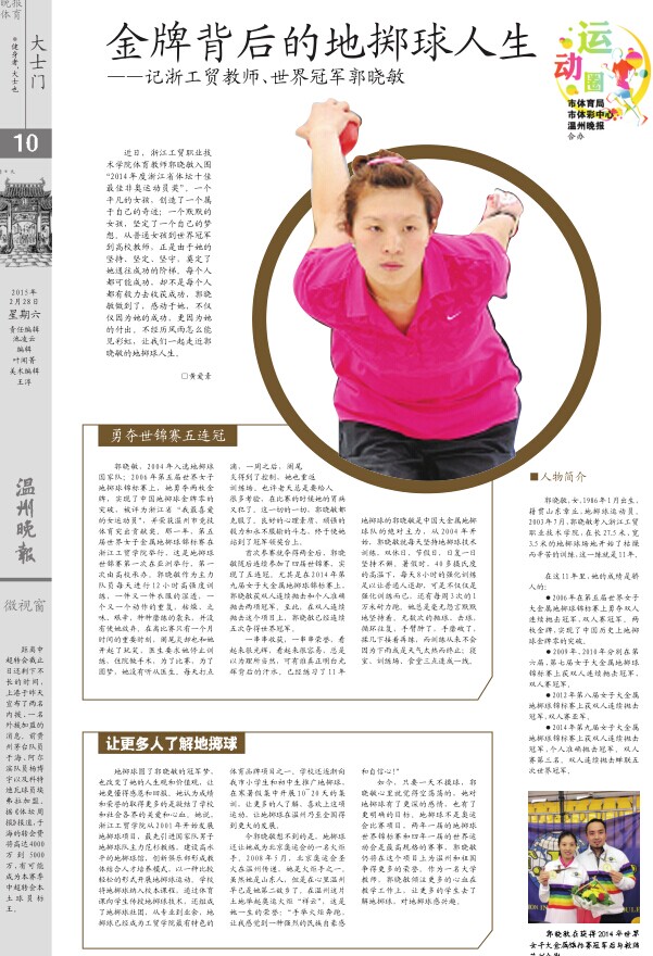近日,伟德BETVlCTOR1946体育教师郭晓敏入围“2014年度浙江省体坛十佳最佳非奥运动员奖”。一个平凡的女孩,创造了一个属于自己的奇迹;一个默默的女孩,坚定了一个自己的梦想。从普通女孩到世界冠军到高校教师,正是由于她的坚持、坚定、坚守,奠定了她通往成功的阶梯。每个人都可能成功,却不是每个人都有毅力去收获成功,郭晓敏做到了,感动于她,不仅仅因为她的成功,更因为她的付出。不经历风雨怎么能见彩虹,让我们一起走近郭晓敏的地掷球人生。□黄爱素