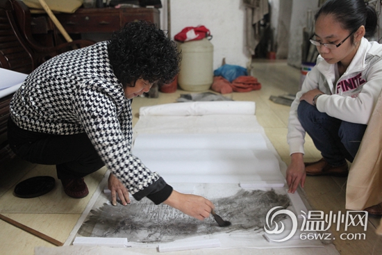 现场,她还向我们演示了印刷底稿的流程。首先,用毛笔在纸上画好所需的底稿,如松鹤长春、八仙过海等;第二,在桌子上铺上画毯,将底稿铺于其上,再将硫酸纸铺于底稿上面,将三者固定;第三,取一枚大头针,在硫酸纸上扎出整幅图案;第四,收起底稿,把瓯绣缎面铺于硫酸纸下面;第五,将油墨和煤油按比例倒入小盘子中,混匀,用刷子蘸取适量油墨,直接在硫酸纸上均匀涂布,整幅画涂完后,针眼处的油墨就会渗透到缎面上,一幅画就算印完了。