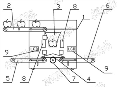 浙大专家特别推荐的水果自动分级装置示意图。装置箱体(1)上部安装输入传送带(2),待检测水果传送进入上大下小喇叭状的透明缓冲篮筐(3),若水果外径比篮筐底部内径大,通过三角形转向器(4)向左侧传送带(5)转,反之,向右侧传送带(6)转;缓冲篮筐侧边的光谱摄像仪(9)还能按卖相进行智能识别分类。