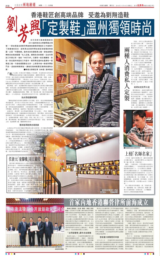 2014溫州時尚文博會開幕式現場,一家由香港名師劉芳興創辦的鞋類研發設計工作室吸引了與會者的目光。談笑風生的劉芳興在接受本報專訪時透露,正因「中國鞋都」溫州良好的製鞋業土壤,使他這種玩轉時尚的高端鞋履「私人定製」獲得良好的發展,自去年開設工作室以來,他的「HKSTAR」已擁有一批忠實顧客。目前,除在溫州市區的工作室外,劉芳興在溫州永嘉擁有一個製造工廠,今後他還籌劃在北京、上海等內地一線城市開設門店,並創辦專業網站,讓他的高端鞋履定製網絡遍佈全國。 ■香港文匯報記者 白林淼 溫州報道