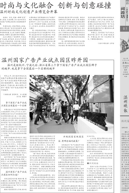 昨天上午,2014温州时尚文化创意产业博览会开幕式暨温州国家广告产业试点园区开园仪式在浙江创意园举行。由此,温州成为继杭州、宁波之后,浙江省第三个拿下“国家广告产业试点园区”牌子的城市。