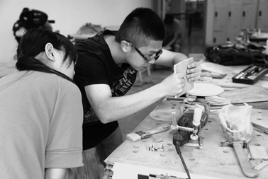 图为团队成员们正在专注地设计和制作低碳环保作品。 (本文图片由浙江工贸职技院提供)
