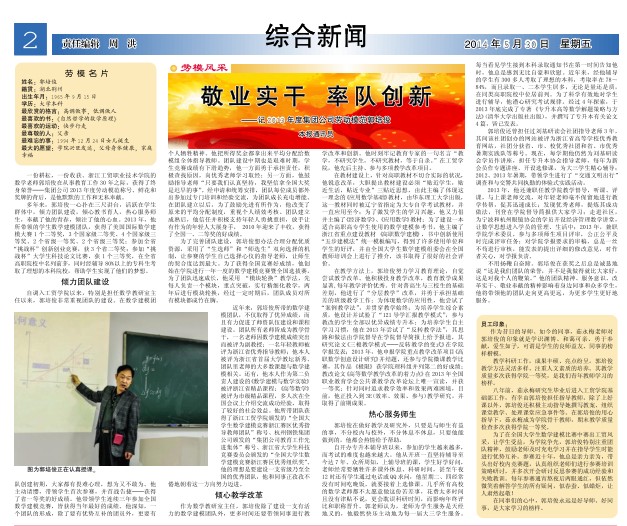 2013年,他还兼职成教学院教学督导,听课、评课,与上课老师交流,对年轻老师毫不保留地进行教学传帮,促其迅速成长。发现优秀老师,提炼其成功做法,刊登在学院督导简报给大家学习;走进社区,为宁波和杭州眼镜协会的学员开设经济管理数学讲堂,让数学思想流进学员的管理、生活中;2013年兼职学院学术委员,参与多项师生项目评审,公正公平及时完成评审任务;对学院学报要求的审稿,总是一丝不苟进行审核,能发表的提出详细的修改意见,对作者关心,对学报负责。