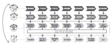 开展人才需求调研,明确建设思路。通过对区域产业结构、劳动就业结构、岗位技能结构进行调研分析,系统梳理学院已有专业的分类组合和品牌专业,确定以电子商务产业链生产经营环节为主线,探索构建包括市场营销、设计(艺术设计、鞋类设计)、图形图像制作、电子商务、物流管理、会计等相关专业构成的专业链,实现关联专业资源共享、协同发展。
