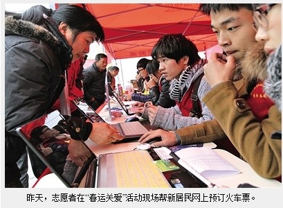 “到成都的票20号之前都没了”,“温州直达阜阳的票很紧张,要不选择转车”,“24号还有两张无座票”……昨天,在火车站广场前,浙江工贸学院的大学生志愿者搭起帐篷,给来来往往的返乡新居民提供查询、订票服务。