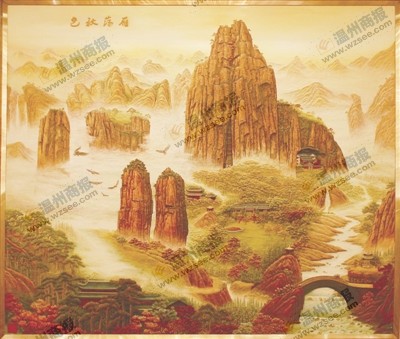 “走进北京人民大会堂浙江厅,左侧墙面展示着瓯塑壁画《雁荡秋色》,以黄红两种暖色为主色调,使整个画面有洒满阳光感觉,整个房间呈现出祥和的氛围。” 浙工贸党委书记何向荣指着完工时拍摄的该幅作品照片介绍说。记者看到,画面视觉焦点雁荡合掌峰高耸入云,气势磅礴;远处重峦叠嶂,视野广阔深远,观音洞、北斗洞、犀牛望月、大龙湫、小龙湫、展旗峰、天柱峰等雁荡美景尽收眼底。一只只翱翔在山峰间的老鹰,更为这幅风景画增添了一份生机和情趣。