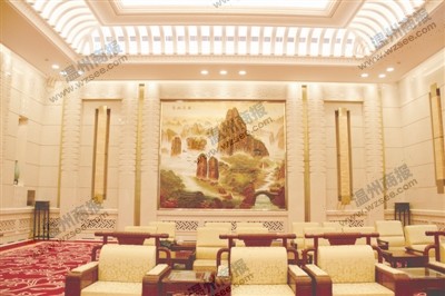 答:从我们团队进场安装开始,北京人民大会堂有关负责人就经常到浙江厅来了解我们的施工情况,一般每周至少来两次 ,其中不少人都去过雁荡山,手拿我们提交的设计效果图,一一比对雁荡山的各处风景点,并提出一些修改建议。当我们完工时,他们说,比效果图更好看,纷纷站在这幅作品前合影留念。