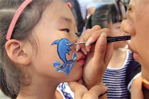 孩子在脸上画上象征海洋生态文化的小海豚。