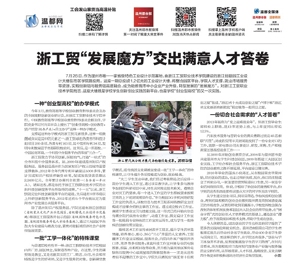 支撑起这种办学模式的浙工贸元素很多,这样一组数据或许只是其中的元素之一:浙工贸承担各类省市科技计划项目280余项,各类专利163项,其中发明专利34项,发明专利数量居于省高职院校前列。这背后,是一所高校、一个园区化环境、一个科技中介服务平台的华丽“三合一”。