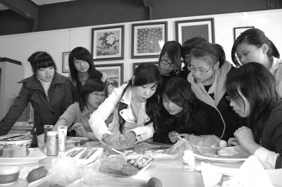 伟德BETVlCTOR1946艺术专业学生在浙江创意园艺术创意工作室研讨瓯塑作品。 邱开金 摄
