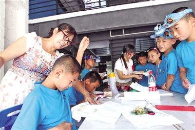 日前,侨界留守儿童探寻瓯绣、瓯塑古文化之旅活动在浙江创意园内举行。来自鹿城区的86名侨界留守儿童走进园区,近距离感受温州传统文化艺术的魅力。图为老师手把手教留守儿童瓯绣的针法。 苏巧将 摄