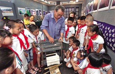 国家级非遗项目蓝夹缬传承人黄宣法在为小朋友演示蓝夹缬的制作工艺。 卢春雨 摄