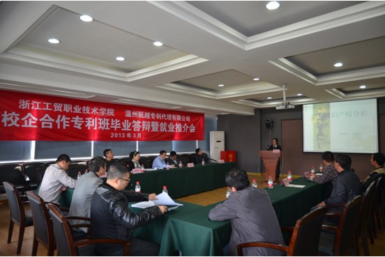 正是因为学生进入企业后即可胜任企业的知识产权实务工作又懂得他原来所学的专业知识,首届专利班毕业生遭到了企业的“哄抢”。今年围绕学院创新创业教育年主题,积极探索新的就业思路和就业方式,特邀正泰集团等7家知名企业参加了本次集毕业答辩、就业推介、就业意向洽谈“三合一”的会议,让企业从毕业论文答辩现场物色人选,直接与意向学生面试交流,双向选择,达成就业意向。