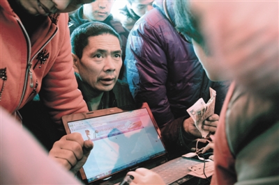 昨天,春运期间关爱农民工志愿服务活动在温州火车站广场举行,志愿者带来手提电脑,帮农民工网上订火车票。一名中年旅客手持现金,急切地想要志愿者帮他订一张回家的火车票。当天,志愿者除帮农民工买票外,还提供理发、热水、食物等服务。 本报记者 王诚/摄