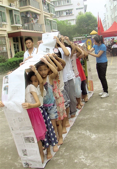 在沿江社区于今年暑期举行的夏令营上,志愿者们带领外来务工者子女做游戏。