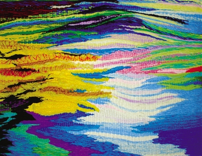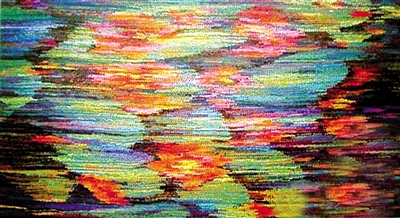 李嘉芝的作品《花光绮霞》,是一幅平面造型的纤维艺术,作品表现的是春季仙人掌花盛开时的抽象意境。作者运用纤维柔软的特性,创作出一种“流光溢彩”的艺术美感,作品采用十六种色彩的丝线编织而成,抽象意境的巧妙运用,产生了“飘渺空间”的美妙艺术性,好象仙人掌花儿在阳光下在春风里欢呼雀跃着,与春光互相追逐着,不但使读者看到花儿的色彩,仿佛还能听到花儿的笑声,唤起人们对美好生活的热情,很自然地达到人的精神深处,引起欢悦的共鸣。十六种色彩,冷暖色彩的强烈对比与调和,流露出作者一种童话般的心境,好象是儿时摇动的万花筒,变化万千。该作品曾参加2002年第二届洛桑·北京国际纤维艺术双年展,获特别奖。